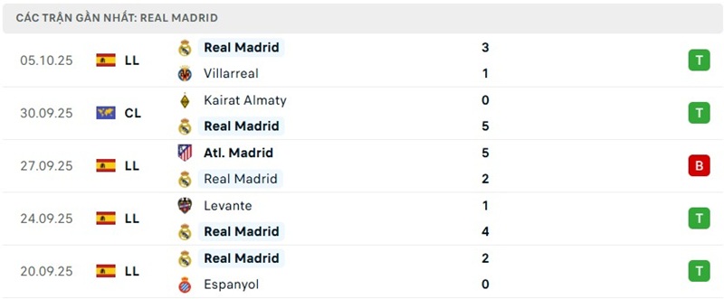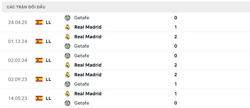 Nhìn lại lịch sử đối đầu, Real Madrid hoàn toàn áp đảo Getafe trong những năm gần đây. “Kền kền trắng” thắng cả 5 lần chạm trán gần nhất, ghi 7 bàn và chỉ để lọt lưới đúng 1 lần. Từ mùa 2023/24 đến nay, họ duy trì chuỗi 7 trận thắng liên tiếp trước đối thủ này, bao gồm các chiến thắng 2-0 tại Bernabeu (tháng 12/2024) và 1-0 ngay trên sân Coliseum (tháng 4/2025).