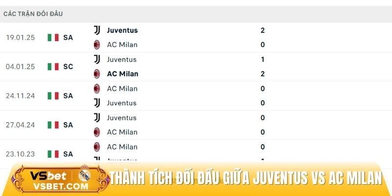 Thành tích đối đầu giữa Juventus vs AC Milan