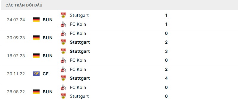 Thành tích đối đầu giữa FC Koln với Stuttgart