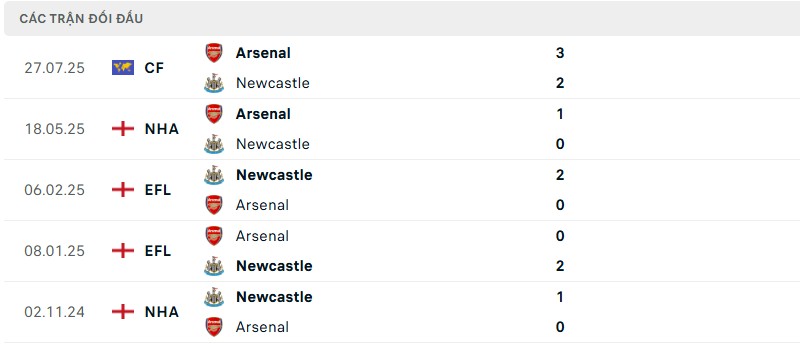 Thành tích đối đầu giữa Newcastle vs Arsenal